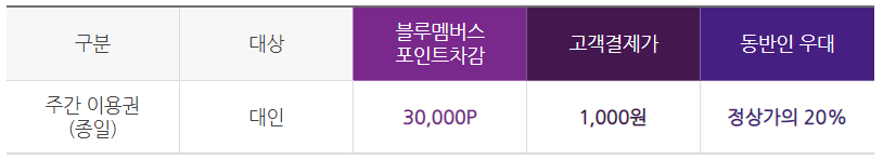멤버스 포인트 30,000P + 1,000원 (고객 결제), 동반인은 정상가의 20% 우대, 4인 가족 방문 시 : 121,000원