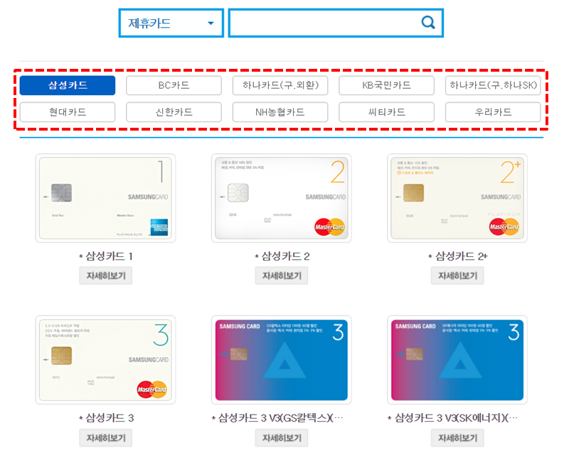 아래 화면에서 카드를 선택한 후 카드명을 검색하시거나 스크롤을 내리셔서 직접 확인하시면 됩니다.