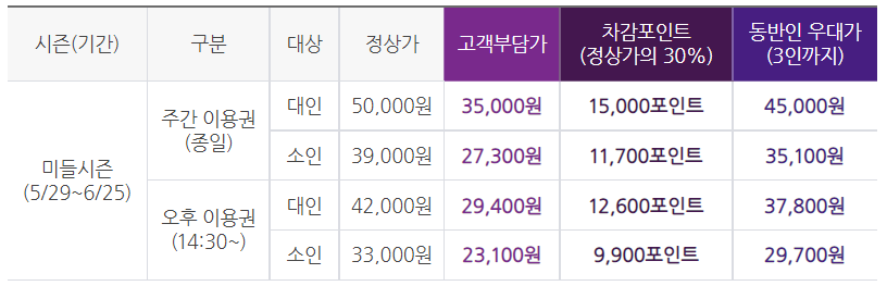 대인만 가능, 정상가의 30% 포인트 적용 휴 차액만큼 고개 부담. 동반인 우대 없음
