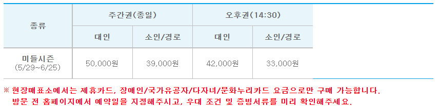 이번 미들 시즌에서 가장 추천하고 싶은 할인이 KB 국민카드 할인입니다. 그 이유는 금액을 확인해 보시면 바로 알 수가 있습니다. 본인도 약 만원에 이용이 가능한테 동반인 3인까지 20,000원으로 우대 혜택이 제공됩니다. 단, 체크 및 기업카드, KB 비씨나 선불카드는 제외이니 참고하십시오.