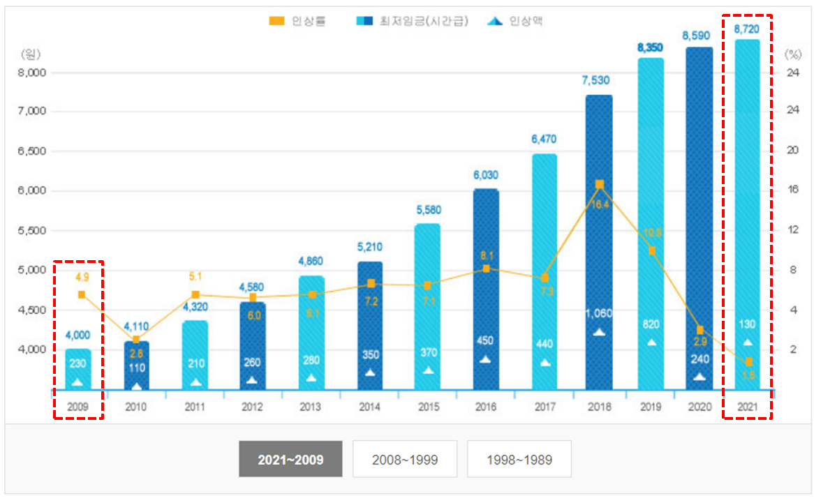 서두에서 언급한 대로 2021년도 최저시급은 시간당 8,720원입니다.