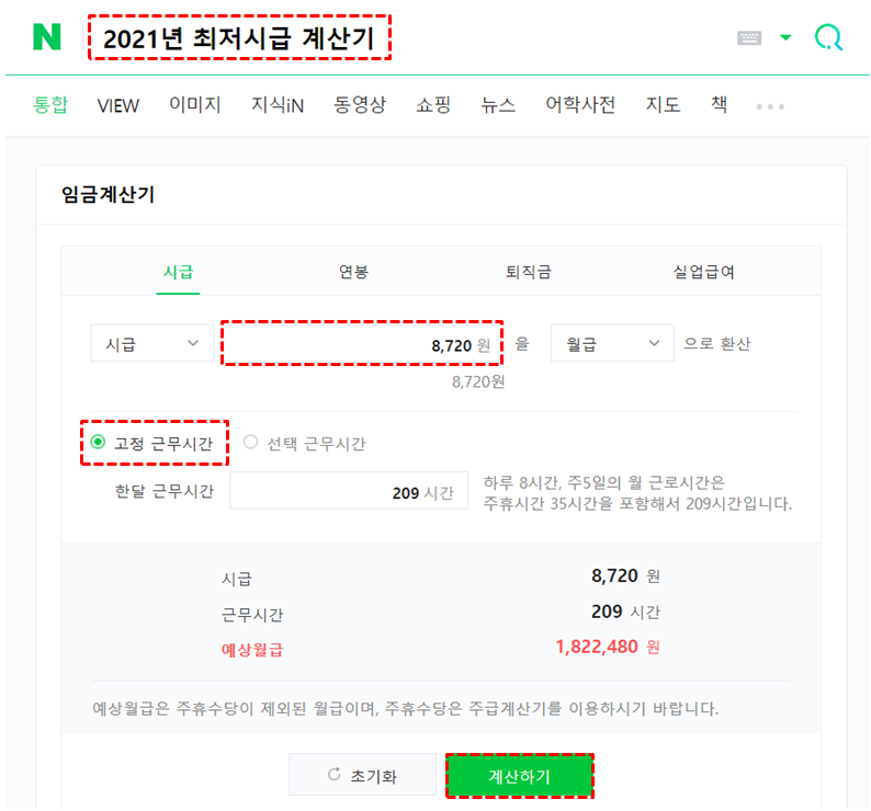 마지막으로 계산기 활용법입니다. 네이버에서 "2021년 최저시급 계산기"를 검색하여 쉽게 계산할 수 있습니다. 크게 선택할 것은 없고 하단의 고정 근무시간과 선택 근무시간만 선택하여 조건을 넣어주시면 쉽게 확인하실 수 있습니다.