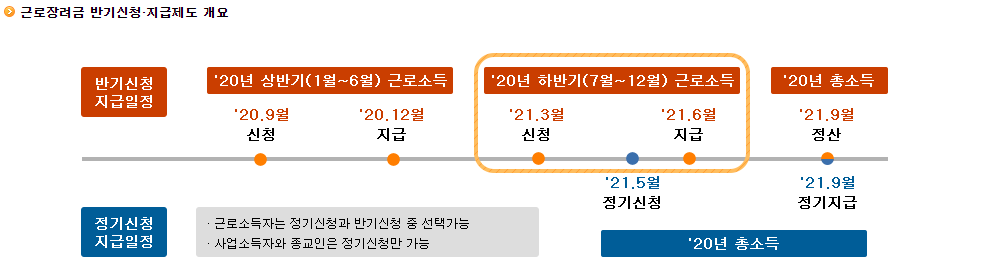 지급방식에 따라 두 가지로 구분되는데요. 정기 지급방식은 기존과 동일하게 5월 신청, 9월 지급으로 운영되고 반기 지급방식은 상반기 근로소득을 9월에 신청하여 12월 지급, 하반기 근로소득은 차년 3월에 신청하여 6월 지급합니다.