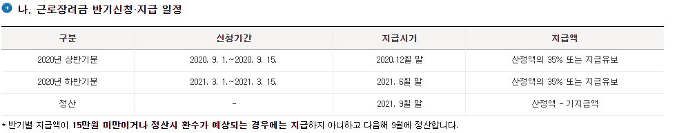 지급방식에 따라 두 가지로 구분되는데요. 정기 지급방식은 기존과 동일하게 5월 신청, 9월 지급으로 운영되고 반기 지급방식은 상반기 근로소득을 9월에 신청하여 12월 지급, 하반기 근로소득은 차년 3월에 신청하여 6월 지급합니다.