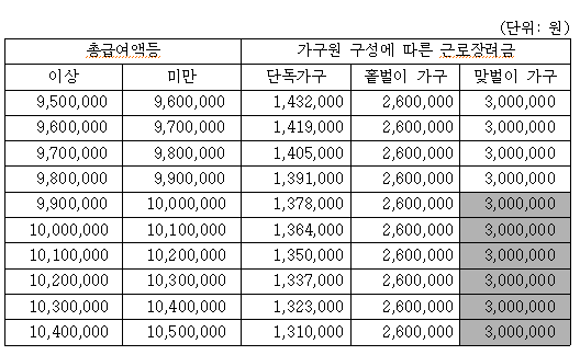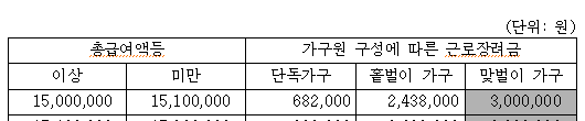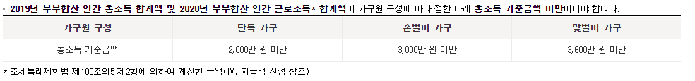 총소득 요건 (부부합산 연간 근로소득이 3,600만 원 이하 등)