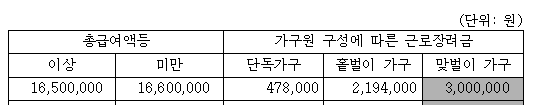 근로장려금 산정표에서 1,650만 원에 해당하는 구간의 맞벌이라면; 3백만 원의 35%인 105만 원 지급
