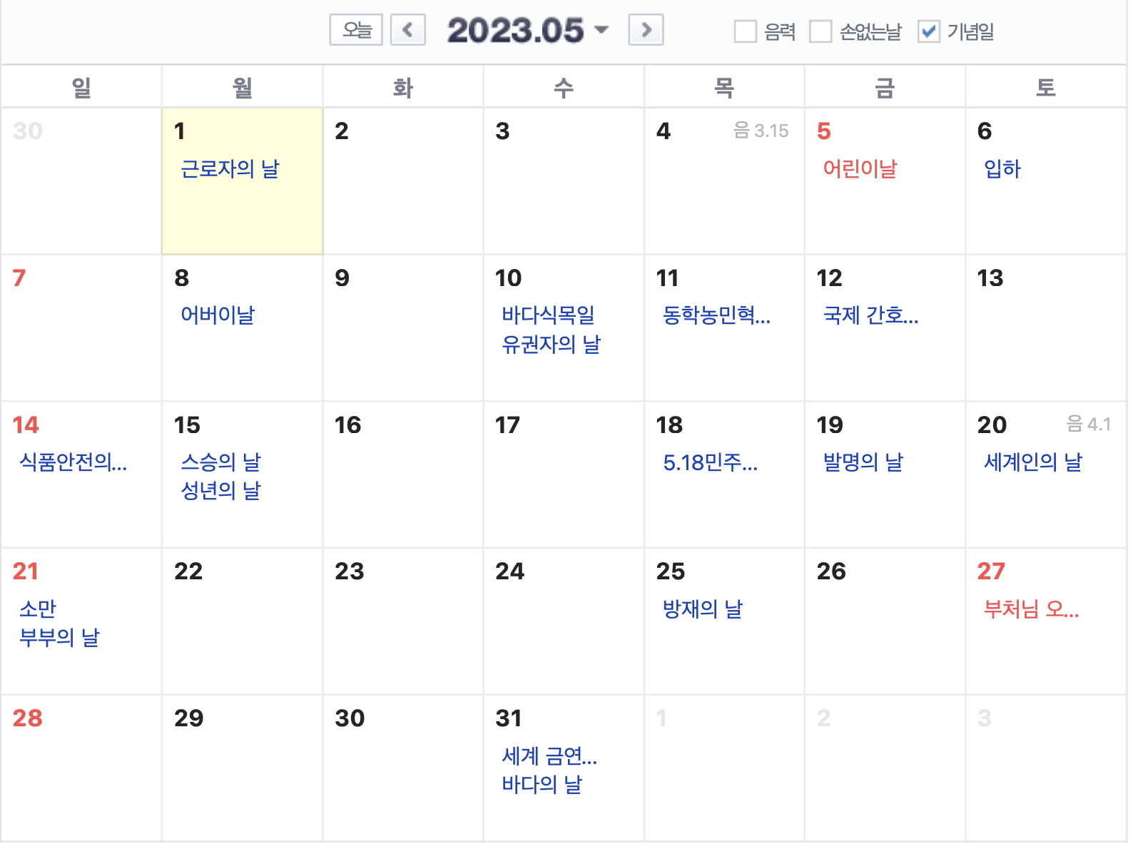 2023년 5월 (근로자의 날(월), 어린이날(금), 부처님 오신날(토))