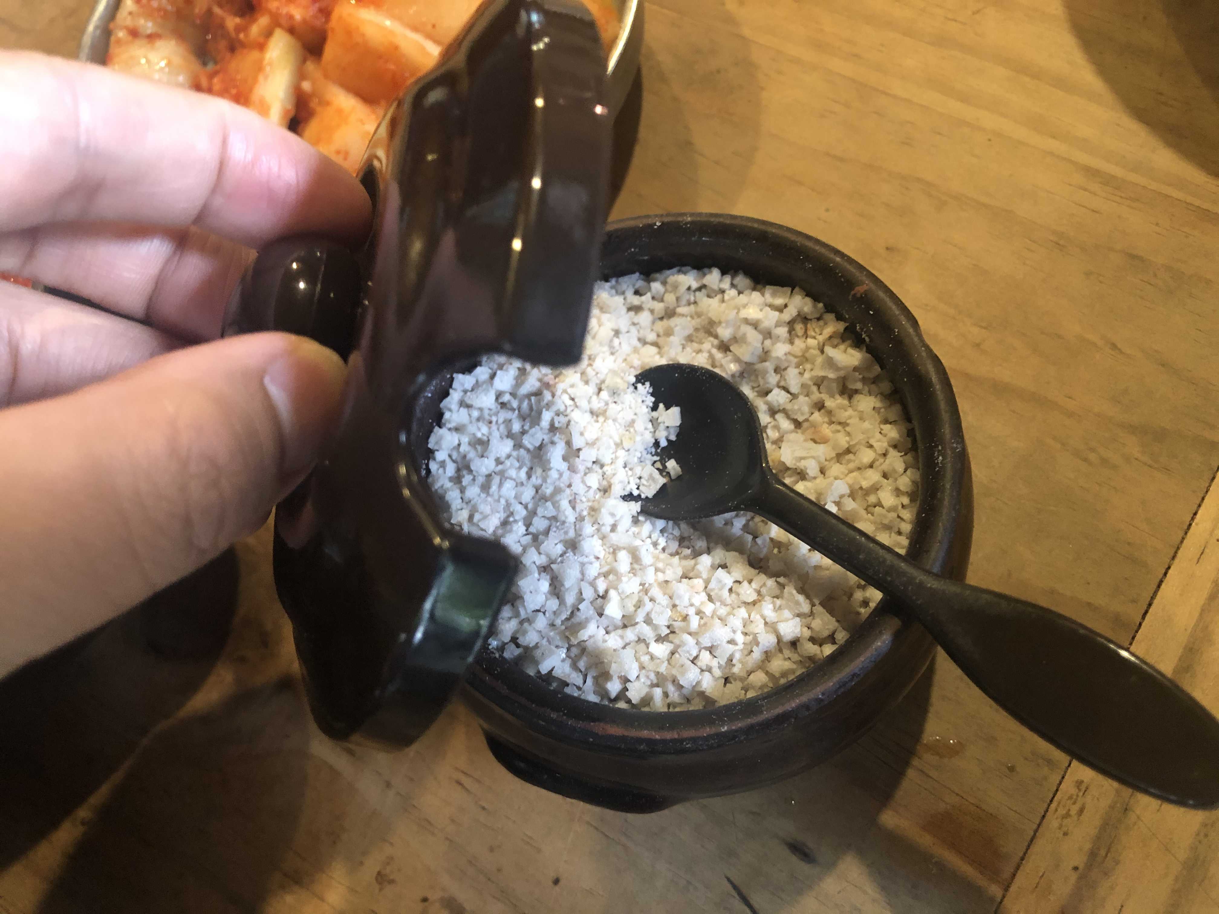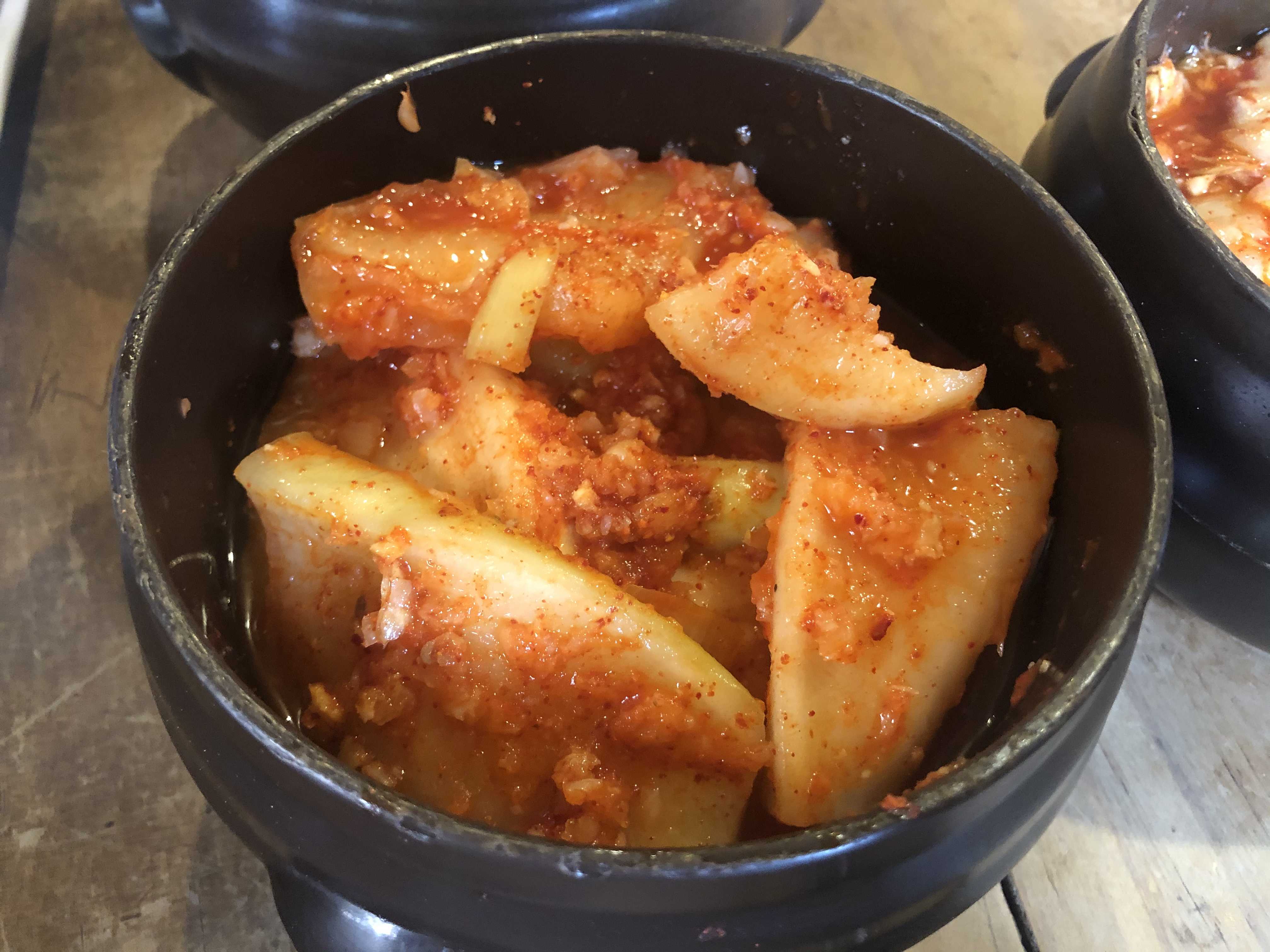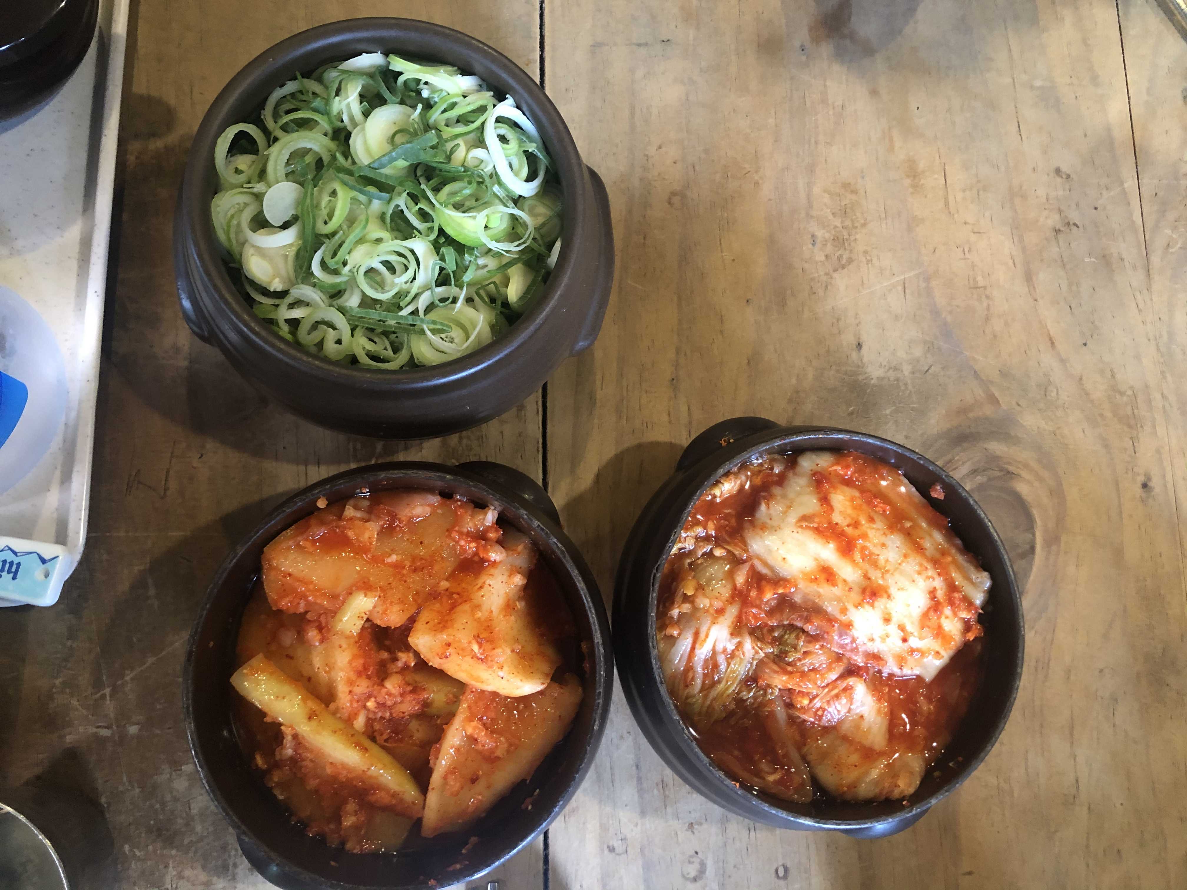 자리에 앉으면 통 한가득 무와 김치 그리고 파가 있습니다. 무와 김치는 먹을 만큼 잘라서 먹고 파는 기호에 따라 탕에 넣어서 먹으면 됩니다. 제가 느끼기에 무는 조금 심심하고 김치는 짭짤했습니다. 개인적으로 간에 상관없이 아삭하게 씹히는 무를 더 좋아하기에 항상 무를 주로 먹습니다.