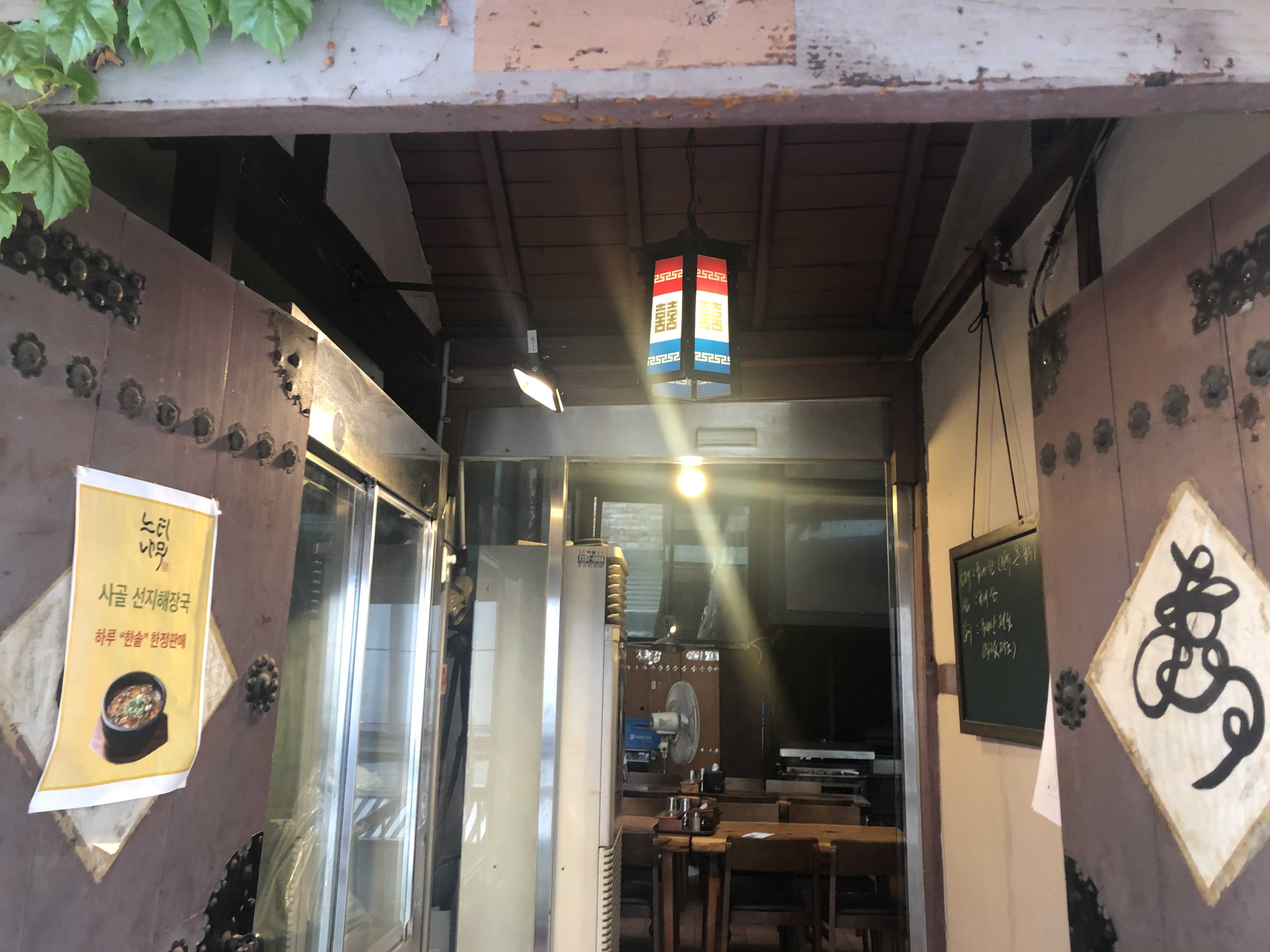이곳에 올라와서 우측으로 돌면 비로소 대문이 보이는데요. 나무로 된 대문만 봐도 옛 생각이 나는데 여기는 전등이 초롱이라고 하나요? 드라마에서 보면 촛불을 안에 놓고 들고 다니는 초롱처럼 되어 있어 더 향수를 자극합니다. 안으로 들어가면 꼭 설렁탕이 아니라 막걸리를 마셔야 될 것 같은 분위기 입니다만 요리를 하시는 주방을 보면 엄청나게 큰 솥이 있어서 설렁탕집인걸 깨닫게 합니다.
