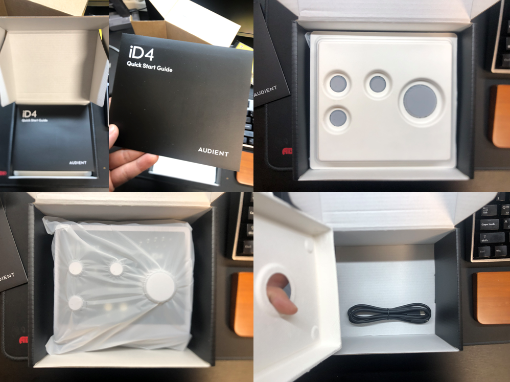 두 번째 박스를 열면 iD4의 설명서가 나오고 그 아래 제품이 들어있습니다. USB-C 케이블은 제일 하단에 들어있네요. 구성품은 오디오 인터페이스 본체와 케이블로 구성되어 있습니다.