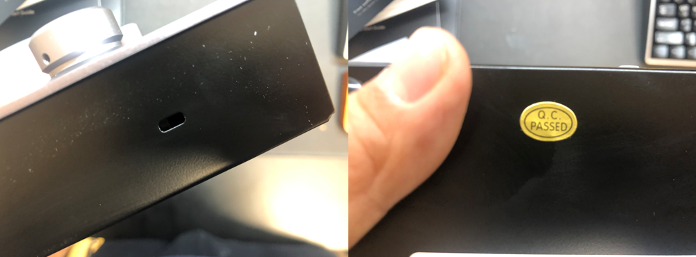 제품 우측에는 꼭 USB-C 충전단자 모양처럼 구멍이 하나 있습니다. 기능이 있을까 모르겠네요. 제품 하단에는 품질인증 스티커도 붙어있습니다.