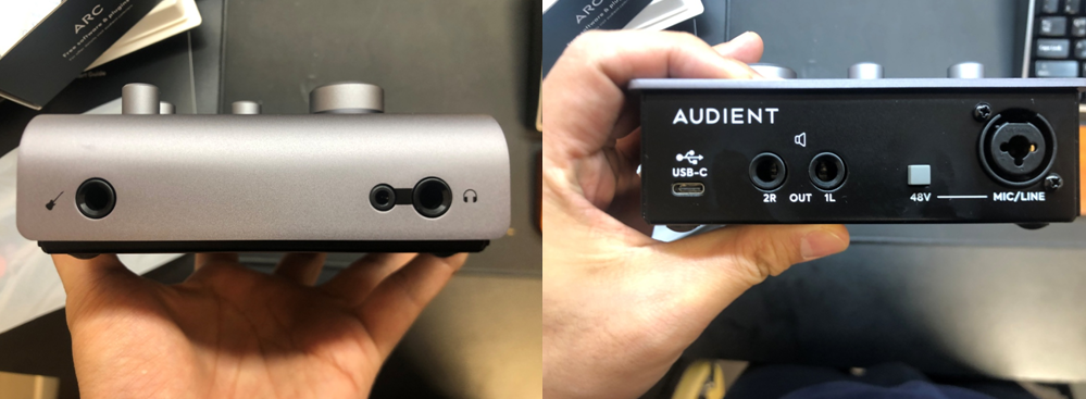 좌측 사진은 오디오 인터페이스의 앞면입니다. 좌측에 악기를 연결할 수 있는 5.5 잭 입력단이고요. 우측은 헤드폰 출력 단자가 크기별로 2개 있습니다.