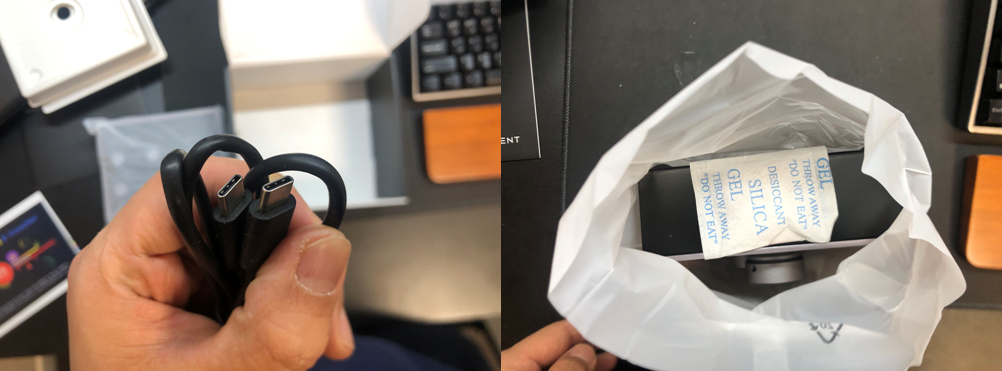 케이블은 C to C 케이블입니다. A to C 케이블이 필요하신 분은 별도로 구매하셔야 합니다. 그리고 제품 비닐을 뜯으면 내부에 습기제거제가 들어있습니다. 아무래도 장비 내부에 습기가 차면 기능에 이상이 발생할 수 있기 때문에 넣어준 것 같습니다. 별거 아니지만 자신들의 제품이 구매자에게 안전하게 배송되게 하려는 의지가 보이는 것 같습니다.