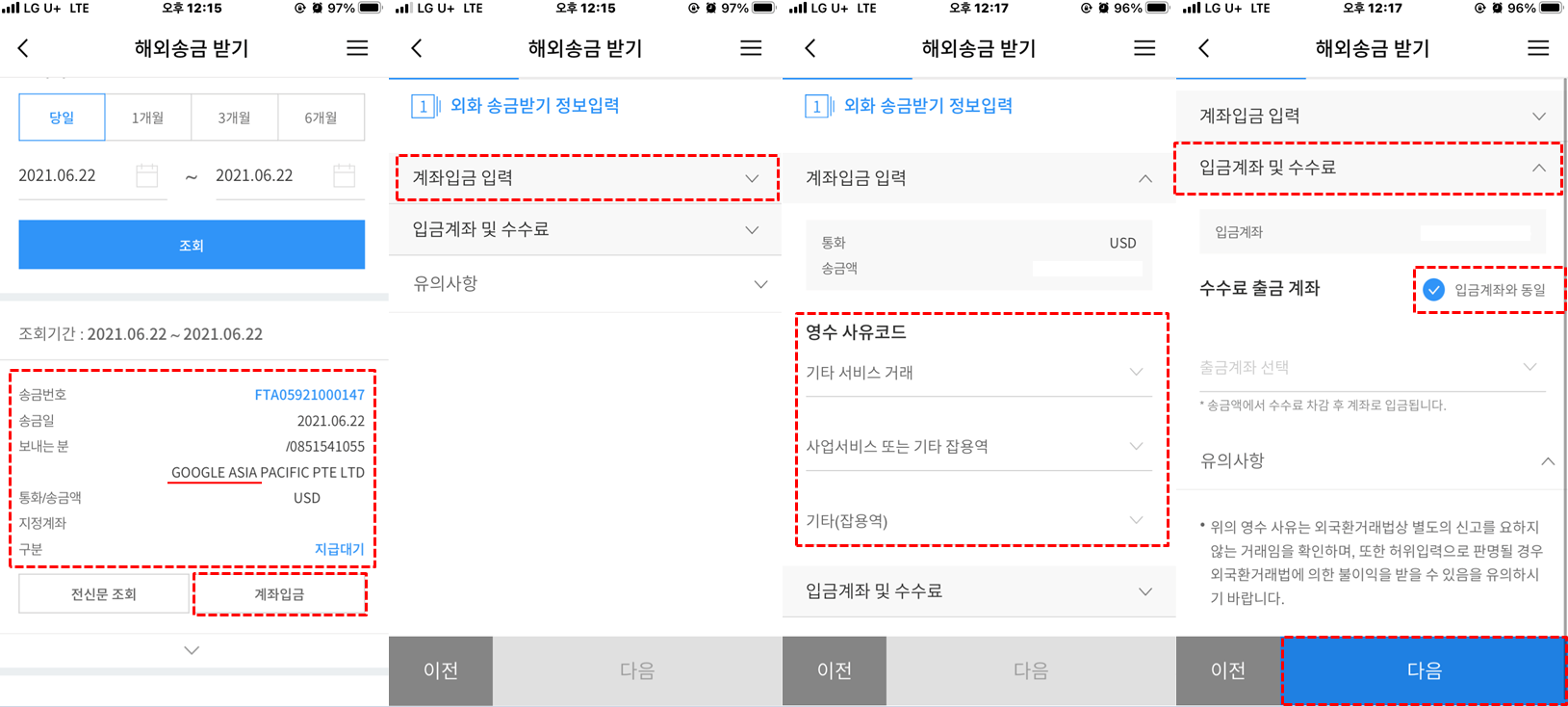 모두 다 선택하시고 다음을 누르면 정보를 확인하라고 나오고 "외화송금받기"를 누르시면 송금이 완료됩니다.