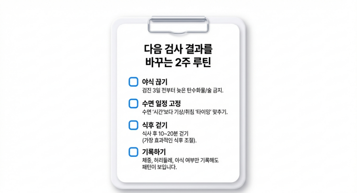 A. “야식/늦은 탄수 줄이기 + 식후 걷기”를 2주만 해보시는 분들이 많습니다. 그리고 재검으로 확인하세요.